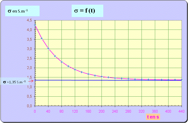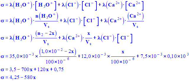 λ (Cl–) = 7,5 - La concentration des ions chlorure ne varie pas. - A chaque fois que deux ions oxonium sont consommés, un seul ion calcium est produit. - Le nombre d'ions présents dans la solution diminue et la conductivité ionique molaire de l'ion oxonium est bien plus grande que la conductivité molaire de l'ion calcium. - Il est logique d'observer une diminution de la conductivité de la solution. c)- Calculer la conductivité σ de la solution à l’instant de date t = 0 s. - Conductivité de la solution au temps t = 0 s. - σ0 = λ(H3O+). [ H3O+ ]0 + λ ( Cl– ). [Cl–]0 - σ0 = {λ (H3O+) + λ (Cl– )}.[ H3O+ ]0 - σ0 = (35,0 × 10– 3 + 7,5 × 10– 3 ) × 0,10 × 103 - σ0 = 4,25 S . m – 1 d)- Montrer que la conductivité est reliée à l’avancement x par la relation : σ = 4,25 – 580 x - Relation donnant la conductivité en fonction de l’avancement x : e)- Calculer la conductivité de la solution pour la valeur maximale de l’avancement. - Conductivité de la solution pour l’avancement maximal. -