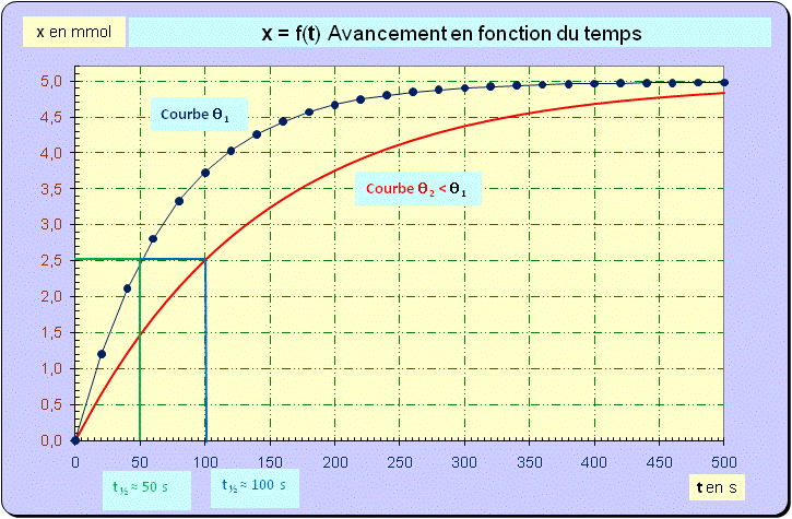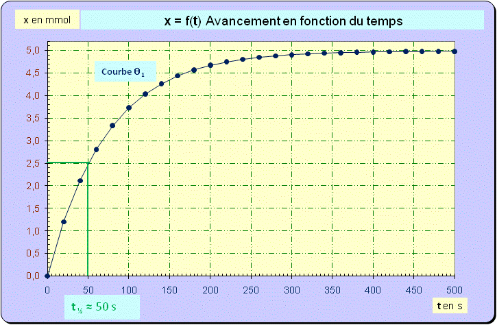 - Dans le cas présent : xf = xmax = n2 ≈ 5,0 × 10– 3 mol - A t ½, x = 2,5 × 10– 3 mol. - Graphiquement, on trouve t ½ ≈ 50 s.