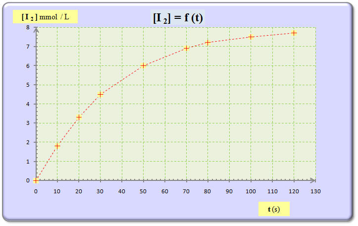 b)- Tracer la courbe représentative de l’évolution de la concentration en diiode [I2] du mélange réactionnel en fonction du temps. - Courbe [I2] = f (t). Échelles : 1 cm ↔ 10 s et 2 cm ↔ 1 mmol / L. c)- Définir la vitesse volumique de réaction v.
