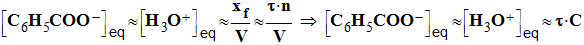 c)- Déterminer une expression de K, constante d’équilibre de la réaction, ne faisant intervenir que la concentration molaire C de la solution d’acide benzoïque et le taux d’avancement final τ de la réaction. (0,75) - L’eau est le solvant, il est en large excès. - L’acide benzoïque est le réactif limitant. - Expression de K :