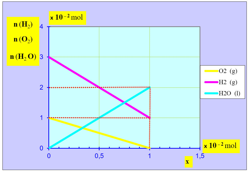 l’eau. Dans son état initial, le système est constitué de 0,030 mol de dihydrogène et de 0,010 mol de dioxygène sous la pression de 1013 hPa et à la température de déterminer