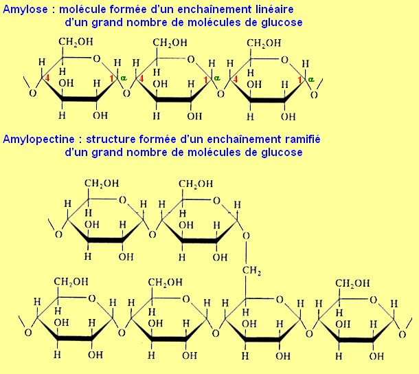 Le terme fécule est réservé au produit issu des tubercules (pommes de terre, manioc...), le terme amidon est réservé au produit issu des graines (blé ou froment, riz, maïs...). Mais il s'agit dans les deux cas du même produit. C'est un polysaccharide de formule chimique (C6H10O5)n. Il est composé de molécules de glucose liées par liaisons α (1, 4), en général caractéristiques des polyosides de réserve (exception: inuline). Il est composé de deux fractions polysaccharidiques :