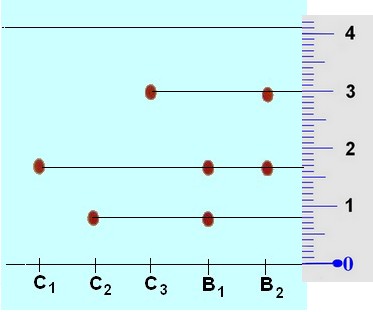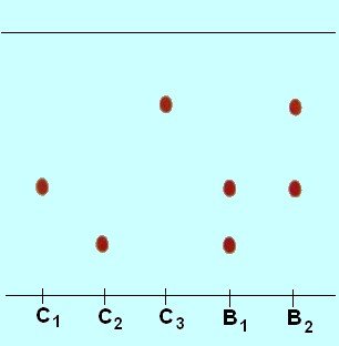 3. Les colorants présents dans chaque bonbon : Le bonbon rouge B1 est contient un mélange des deux colorants C1 et C2. Il apparaît deux taches aux mêmes niveaux que C1 et C2. Le bonbon rouge B2 est contient un mélange des deux colorants C1 et C3. Il apparaît deux taches aux mêmes niveaux que C1 et C3. |