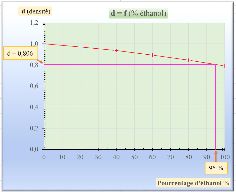- D’après le graphique, l’alcool à 95 ° contient 95 % d’éthanol en volume.