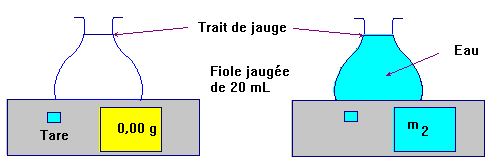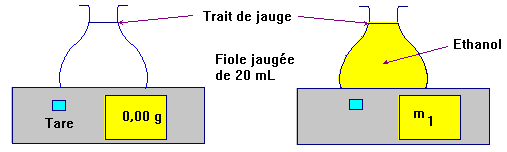 2. Protocole expérimental. Première étape : Peser la masse d'éthanol contenu dans une fiole jaugée de volume V = 25 mL. Deuxième étape : Peser le même volume V = 25 mL d'eau. Troisième étape : Faire le quotient des deux masses.