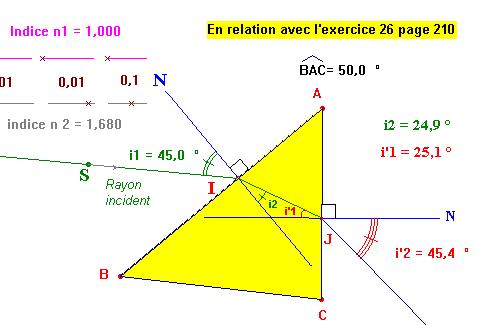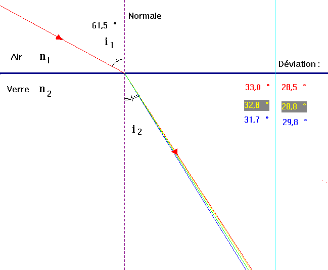 pour la radiation rouge : - De la même façon, on trouve : - - i2R ≈ 26 ° b)- Déviation due à la première surface de séparation traversée. - Déviation lors de la première réfraction pour la radiation bleue. - DB = i1B - i2B - DB = 45 - 25 - DB ≈ 20 ° - Déviation lors de la première réfraction pour la radiation rouge. - DR = i1R - i2R - DR = 45 - 26 - DR ≈ 19 ° c)- Valeur numérique de i’1 pour chaque radiation étudiée. - Vérification de la relation avec :