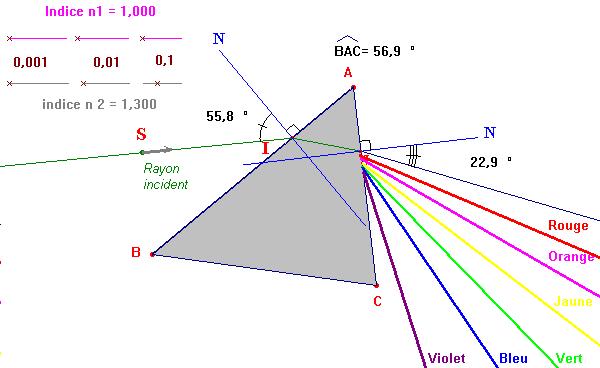 d’angle  de lumière blanche d'incidence i1 = 45 °. a)- Calculer l’angle de réfraction i2B pour la radiation bleue puis l’angle de réfraction i2R pour la radiation rouge. b)- Pour les deux radiations, en déduire la déviation due à la première surface de séparation traversée. c)- Dans le cas de la radiation bleue, vérifier avec un rapporteur sur une construction géométrique soignée que l’angle d’incidence sur la face de sortie