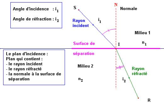 au plan d’incidence. - Deuxième loi de Descartes : n1. sin i1= n2 . sin i2 (1). |