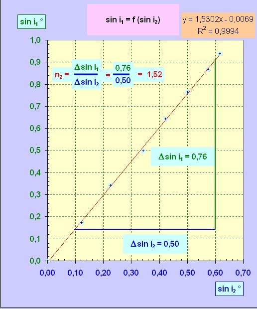 - Graphe : - Les points sont sensiblement alignés. - La droite moyenne passe par l’origine : - On peut écrire que : sin i1 = k . sin i2 - avec k ≈ 1,52. 3. Indice de réfraction du plexiglas : - D’après la loi de Descartes : n1 . sin i1 = n2 . sin i2. - On en déduit que : - |