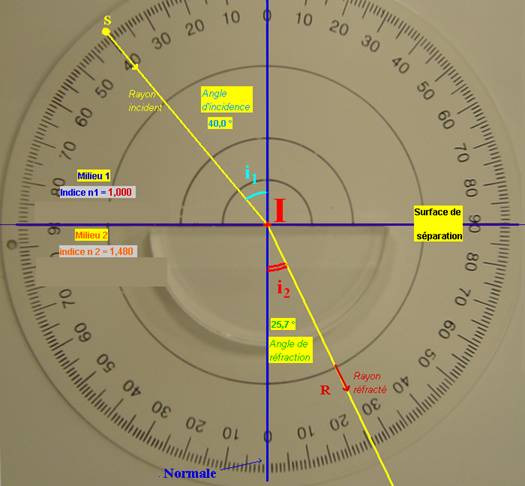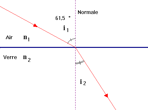 1)- Reproduire et compléter le schéma ci-dessus en indiquant le point d’incidence, en dessinant la normale à la surface de séparation