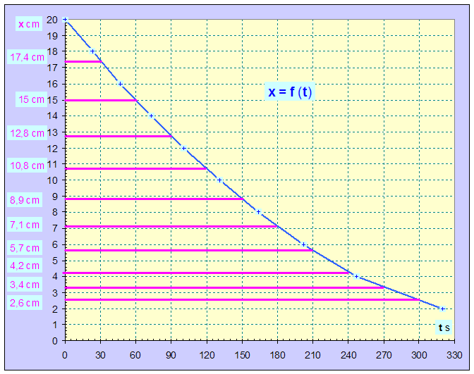 Cet instrument primitif fonctionnait à l’aide de liquides. Déjà connu des égyptiens et des Grecs, elle servait à limiter le temps de parole des orateurs. Comment fabriquer une clepsydre simplifiée avec une bouteille percée d’un petit orifice en son extrémité inférieure ? On découpe une bande de papier millimétré de longueur correspondant à la partie de la bouteille qui a un diamètre constant. On remplit d’eau la bouteille en bouchant le trou avec le doigt. À partir d’une position initiale x = 0 du niveau de l’eau, on déclenche un chronomètre au moment où l’eau commence à couler, et on relève les temps correspondant à certaines positions x du niveau de l’eau. On obtient les résultats ci-dessous : |