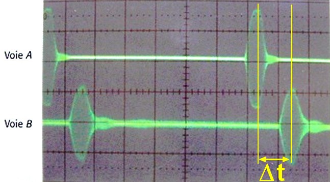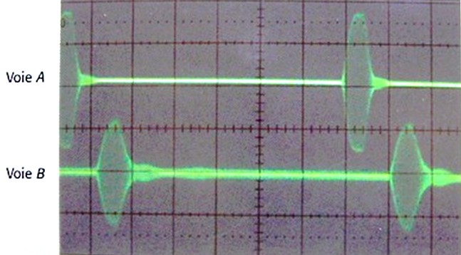 la vitesse des ultrasons Un dispositif E émet des salves d’ultrasons que reçoivent deux récepteurs (R1 et R2), R2 étant le plus éloigné de E. On connecte R1 à la voie A d’un oscilloscope et R2 à la voie B. On obtient l’oscillogramme ci-dessous. La distance séparant les faces d’entrée