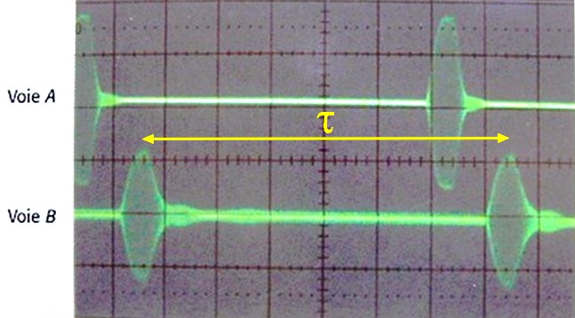 = Balayage de l’oscilloscope est sur la sensibilité b = 2 ms / div. 1. Durée t séparant deux salves consécutives. - τ