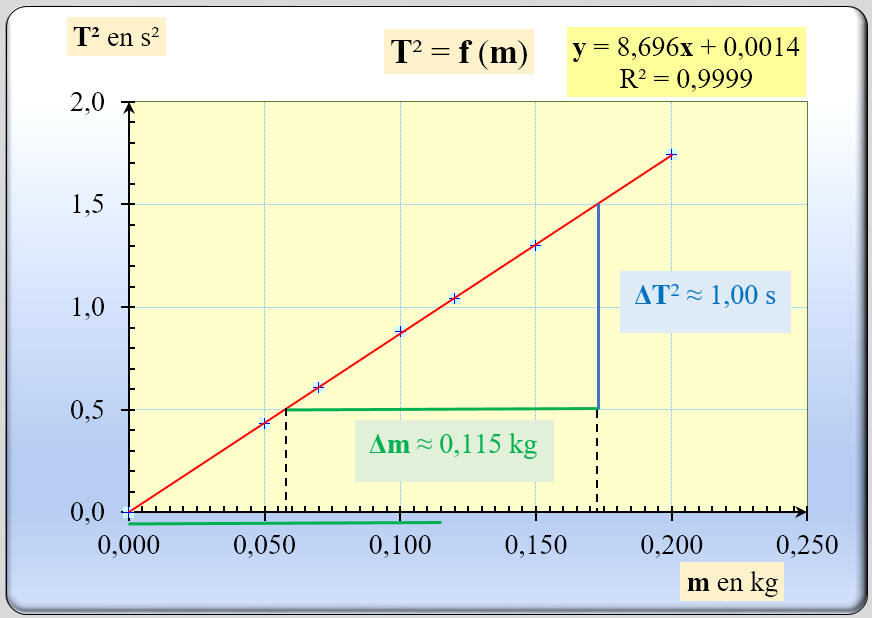 - D’après la lecture du tableau, on peut affirmer que la période dépend de la masse. - La période augmente lorsque la masse augmente. - Lorsque la masse est multipliée par quatre, la période est multipliée par deux. - On peut faire une étude graphique : représenter T2 en fonction de m : - L'après l'étude statistique réalisée avec le tableur Excel : T2 ≈ 8,696 . m - La relation est du type suivant : - T2 = a . m. - Avec a étant le coefficient directeur de la droite moyenne : - En gardant trois chiffre significatifs, la valeur de a est la suivante : - a ≈ 8, 70 s 2 / kg - - La période des oscillations dépend de la masse m et de la constante de raideur k du ressort. - Pour le même ressort, les caractéristiques ne changent pas sur la Terre et sur la Lune. - La période des oscillations est la même sur la Terre et sur la Lune. - La masse qui permet d’avoir une période d’une seconde est m ≈ 120 g. |