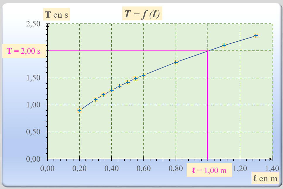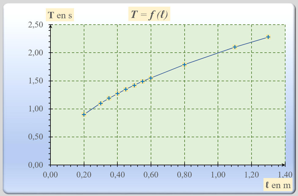 ℓ = On refait les mesures. La période du nouveau pendule est-elle plus grande ? Plus petite ? Ou bien égale à celle réalisé avec une sphère de cuivre ? 2. Exploitation du graphique : a. Sur papier millimétré, tracer la courbe T (ℓ) : ℓ est en abscisse et T en ordonnée. b.