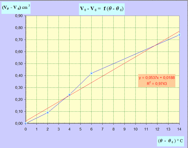 On trace la droite moyenne en rouge : à l'aide d'Excel, on trace une courbe de tendance. On sélectionne comme type ''linéaire'', puis on demande l'affichage de l'équation de la courbe et du coefficient de détermination R2. - On obtient une courbe ascendante. - La fonction représentée n’est pas linéaire. - L’eau a un comportement particulier : Vθ - V6 ≠ a . (θ - θ6). |