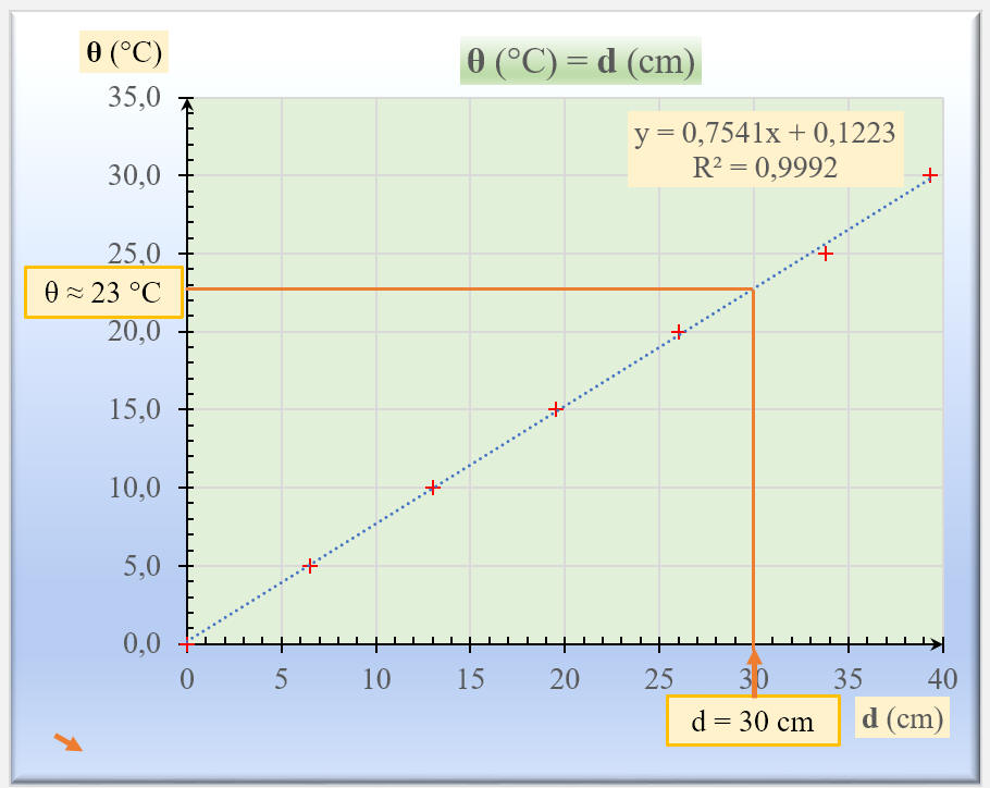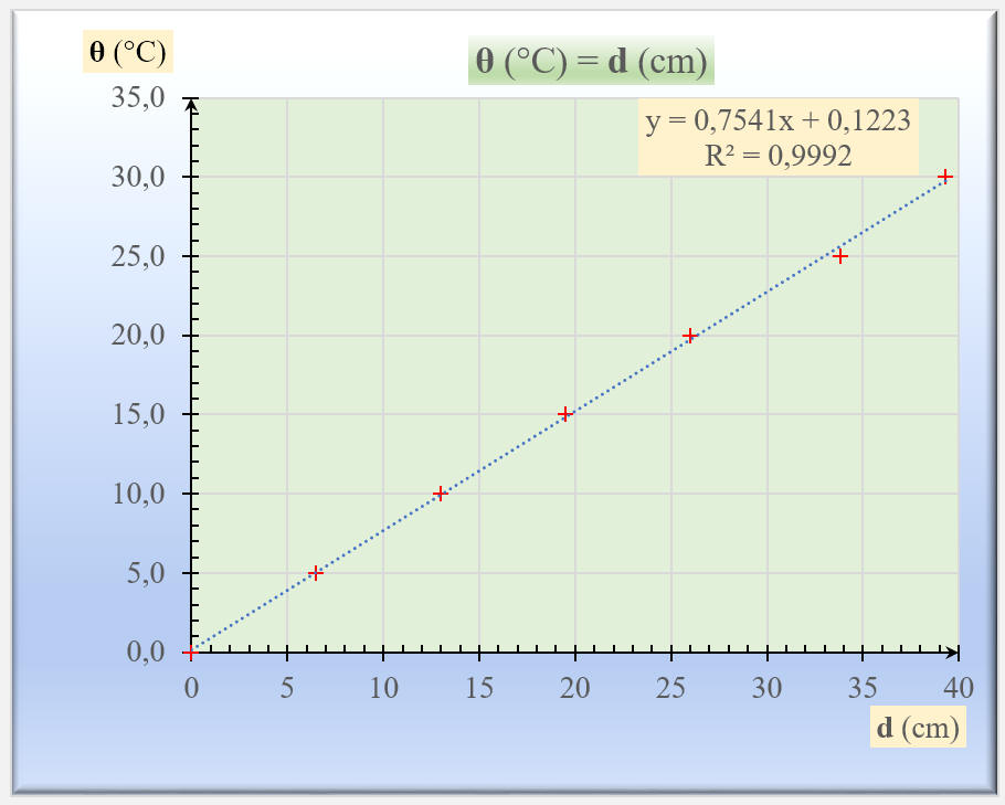 en fonction de la position d de l’index. 3)- Lorsque ce thermomètre est placé dans l’air de la salle de classe, on note d = 30 cm. Quelle est la température correspondante ? |