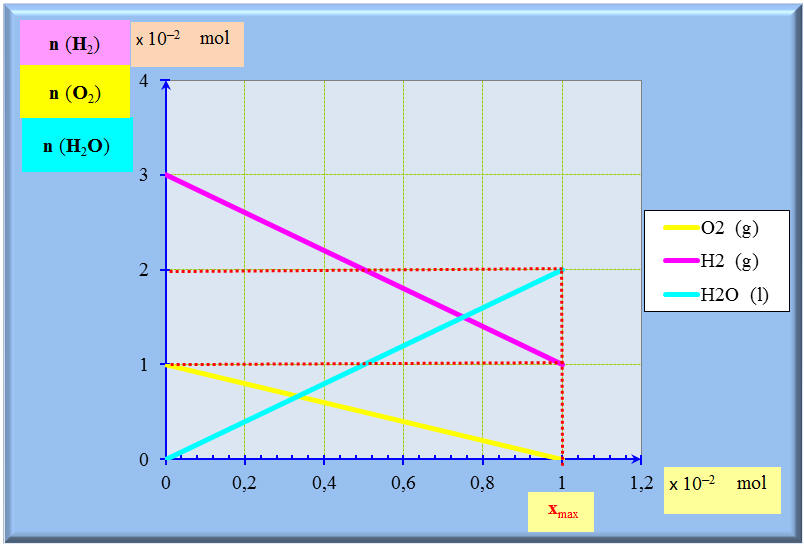 - À l’état final : n (O 2) ≈ 0,0 mol ; n (H2) ≈ 1,0 × 10 - 2 mol - et n (H2O) ≈ 2,0 × 10 - 2 mol.