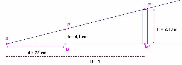 = 1)- Faire un schéma légendé de la situation décrite et indiquer les valeurs des différentes mesures. Tracer les rayons lumineux qui proviennent des extrémités de la porte-fenêtre. - Schéma : Cliquer sur l'image pour l'agrandir 2)- Déterminer la distance D de l’œil à la porte-fenêtre. Justifier votre réponse. - Les droites (PM) et (P’M’) sont parallèles. - On peut appliquer le théorème de Thalès à la figure géométrique : -