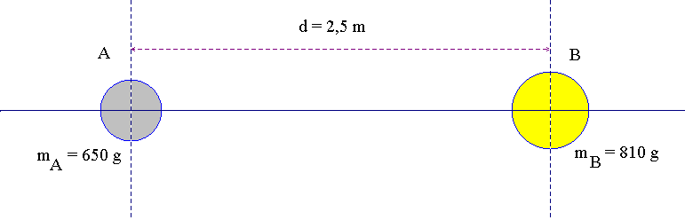 Deux boules de pétanques, l’une de centre A et de masse mA = 650 g, l’autre de centre B et de masse mB = 810 g, sont posées sur le sol. La distance entre leurs centres est d = 2,5 m. On donne : G = 6,67 x 10 – 11 m 3 . kg – 1 . s – 2 et g = 9,8 N / kg.