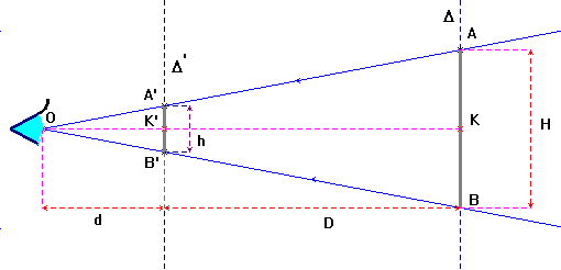 Paul colle sur la vitre de sa chambre une bande rectangulaire de hauteur h = 15,2 cm, placée horizontalement. La bande cache l’immeuble qui se trouve en face du sien. Il observe d’un seul œil et la distance entre son œil et la fenêtre est d = 81,5 cm. Il sort de chez lui et compte 120 pas pour mesurer la distance D entre les deux immeubles.
