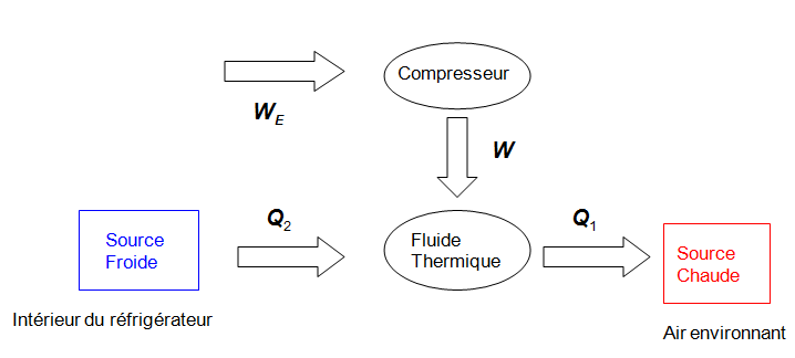 - Le compresseur du réfrigérateur utilise de l’énergie électrique WE.